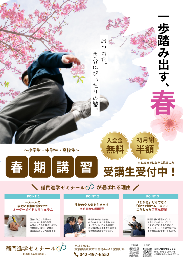 - 今年受験を終えた人や新中学1年生は、3月から予習開始